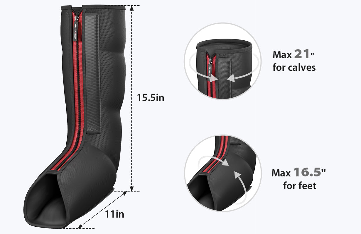 Featuring advanced pressure sensor technology, it ensures that individuals with varying leg sizes can enjoy an equal massage intensity. The device accommodates calves up to 21" and feet up to 16.5".