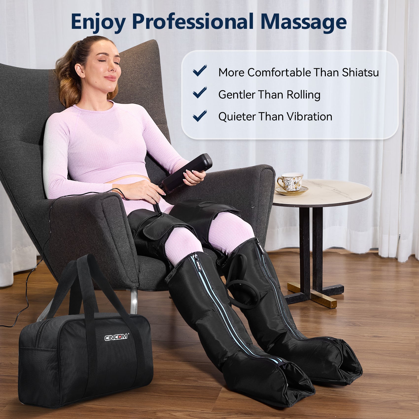 CINCOM leg compression massager not only can help with RLS and edema, but also deeply relieves sore muscles and improves blood circulation. It is a great choice for the elderly, athletes, sport enthusiasts, workers and more.