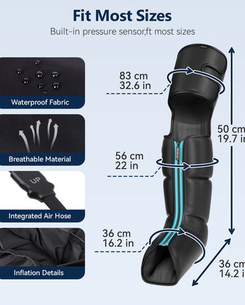 Featuring advanced pressure sensor technology, it ensures that individuals with varying leg sizes can enjoy an equal massage intensity. The device accommodates calves up to 21" and feet up to 16.5".